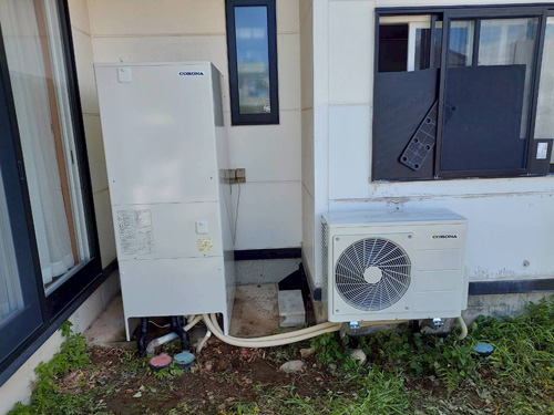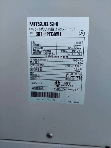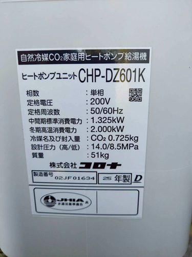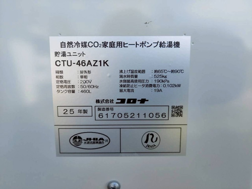 宇佐市赤尾 三菱電機CO2ヒートポンプ給湯機貯湯タンクユニットSRT-HPTK46W1→コロナ自然冷媒CO2家庭用ヒートポンプ給湯機ヒートポンプユニットCHP-DZ601K、貯湯ユニットCTU-46AZ1K エコキュート交換工事