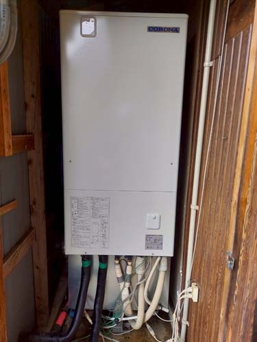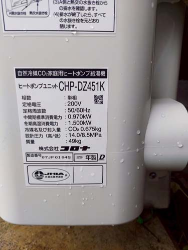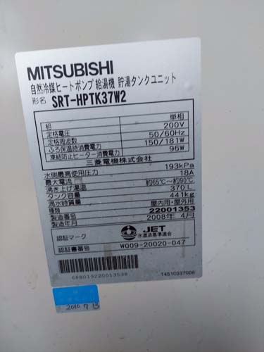 日出町川崎 三菱電機自然冷媒ヒートポンプ給湯機 貯湯タンクユニットSRT-HPTK37W2→コロナ自然冷媒CO2家庭用ヒートポンプ給湯機 ヒートポンプユニットCHP-DZ451K エコキュート交換工事